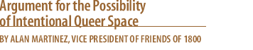 It is a new and unprecedented occurrence that with the existence of GLBT institutions, and their reaching an age and maturity in which they need permanent facilities, there arises the new possibility of public, non-commercial intentional queer space in the world. Since there is historically a thread of gay sensibility in the inhabitation in the space, in being in the world which has almost always been expressed unconsciously or unintentionally, how will it now be expressed consciously and intentionally? How should the new public GLBT space be created and experienced within the context of its particular function, and what should it communicate of queerness to the various GLBT clients and users and to the larger culture?